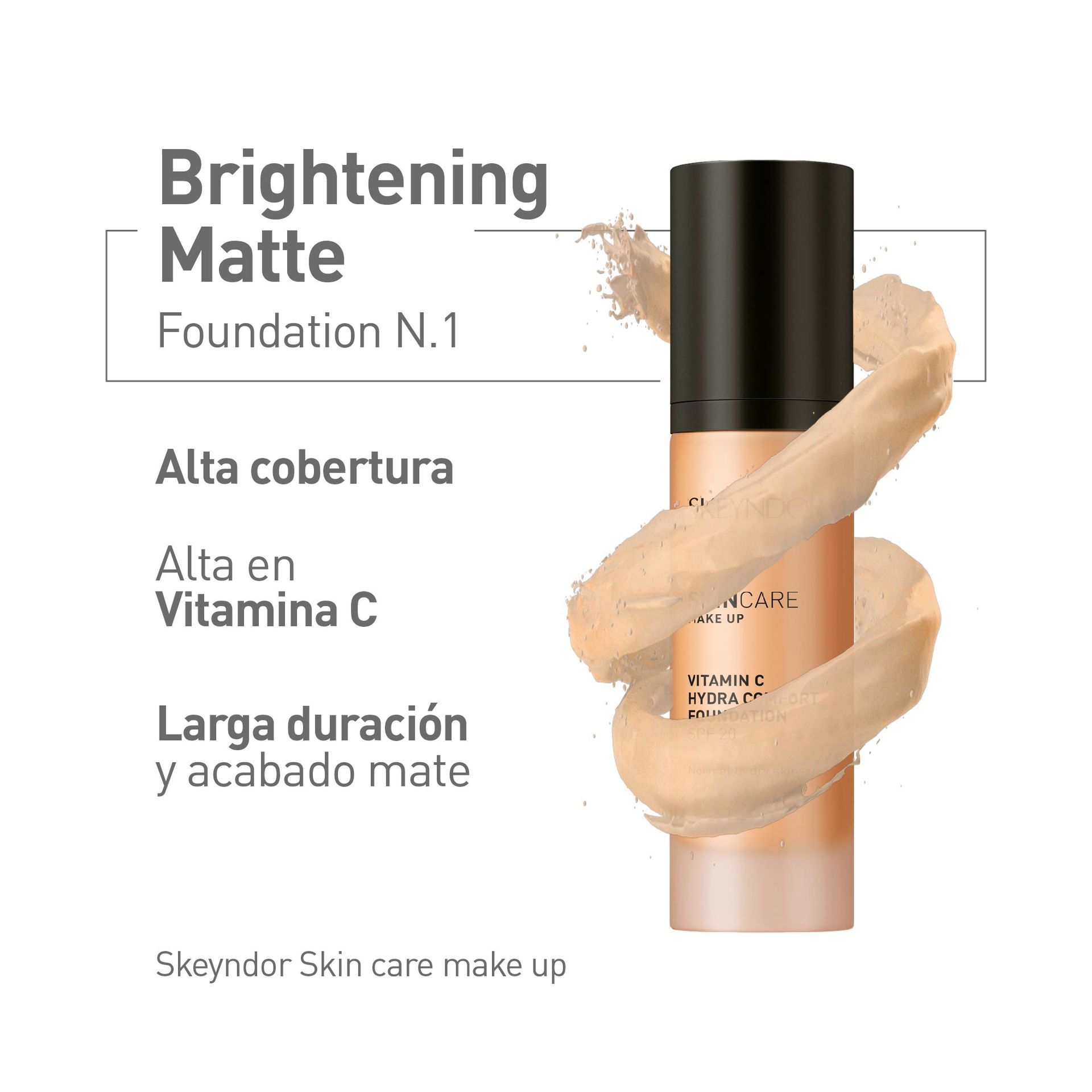 Base con vitamina C de Maquillaje fluido de larga duración, alta cobertura y acabado mate. Fórmula “NEVER DRY” que asegura un look de maquillaje recién aplicado durante todo el día.